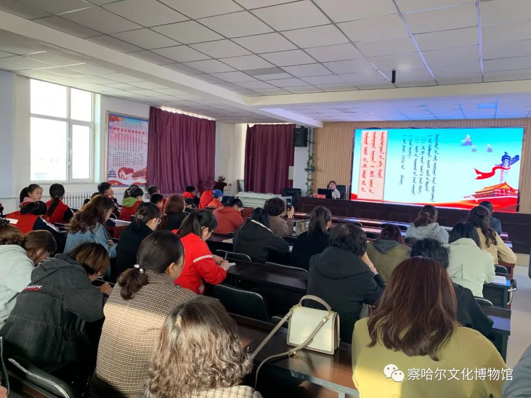 在中国共产党百年华诞即将到来之际,为深入贯彻学习习近平总书记关于“学习党史、国史,是坚持和发展中国特色社会主义、把党和国家各项事业继续推向前进的必修课”的重要论述精神,4月27日,察哈尔文化博物馆联合察右后旗蒙古族学校共同开展第二季度重大主题社科普及教育宣传活动——“进校园 学党史”知识讲座。察哈尔文化博物馆社科普及宣传小组全员参加,由研究员早尼其其格为高年级的学生及全校教师讲述中国共产党的辉煌百年奋斗史。