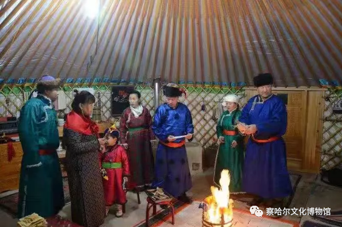 在察哈尔地区,祭火的时候,大家都要换上节日盛装,妇女要戴上头饰,打扮整齐,人们首先集中在全浩特中的长者家开始祭火仪式。先为家中的神像供佛点燃佛灯和线香,然后将燃有蒸香的香炉在人们手中顺时针传递。这是在进行祭火前的净身礼。灶火点燃后,这家的长者率领全家面向图鲁嘎或灶台,行三拜九叩礼。等火燃旺后把图鲁嘎或灶台四角粥灯的灯芯挖出来与垫纸一块儿以及图鲁嘎四角的彩线穗扔进火里,然后开始诵念祭火经,喇嘛或俗人均可诵念。还要准备一些酒、枣、油脂、黄油等祭献物备用。这种祭火仪式一家一家地顺延到全浩特祭祀完毕才结束。
