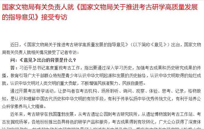 国家文物局有关负责人就《国家文物局关于推进考古研学高质量发展的指导意见》接受专访近日,《国家文物局关于推进考古研学高质量发展的指导意见》(以下简称《意见》)出台,国家文物局有关负责人就相...